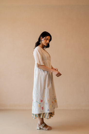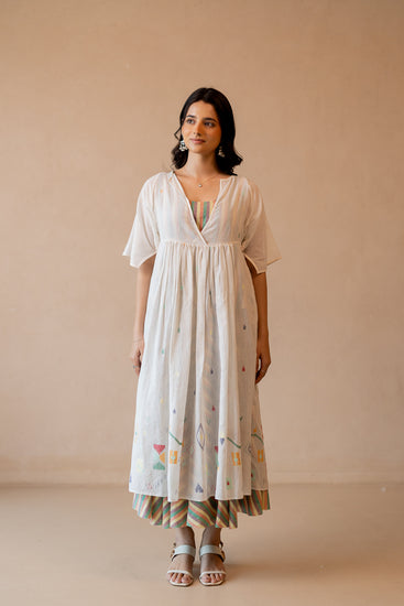 Pleated dress, made from lightweight mul cotton with a Jamdani weave border at the hem and all over motifs