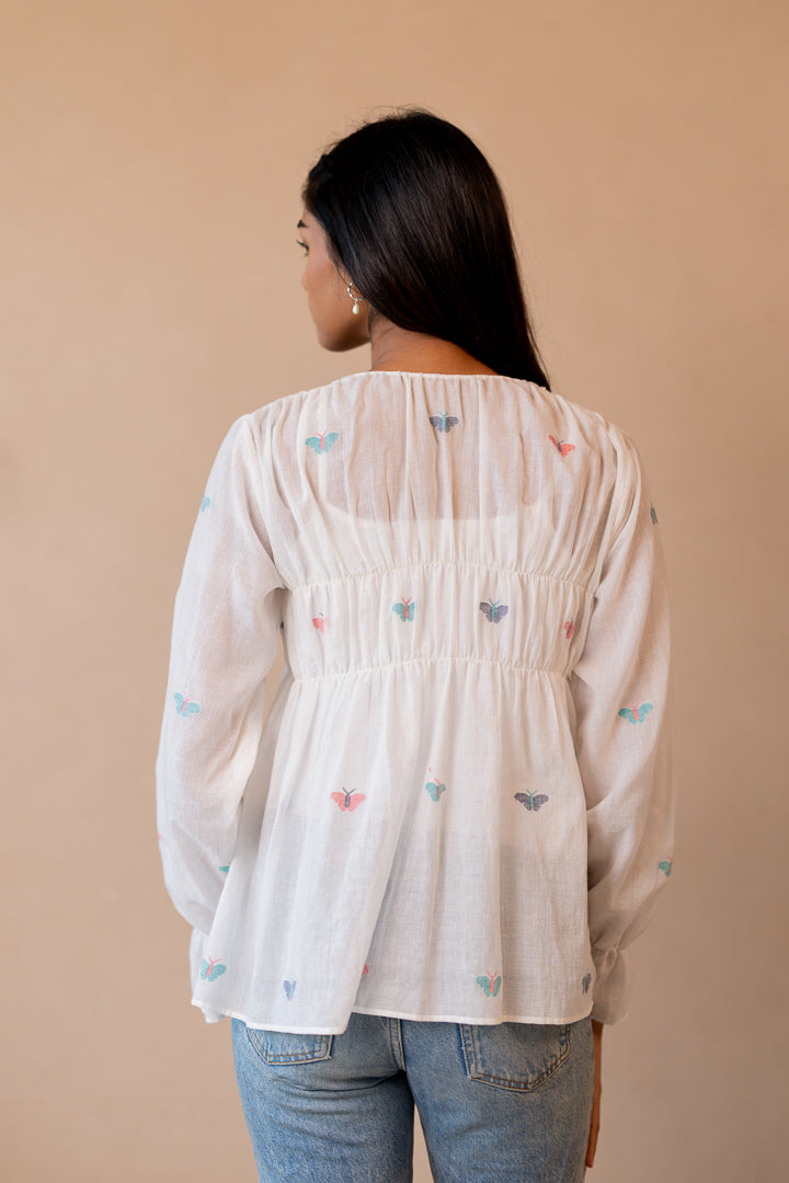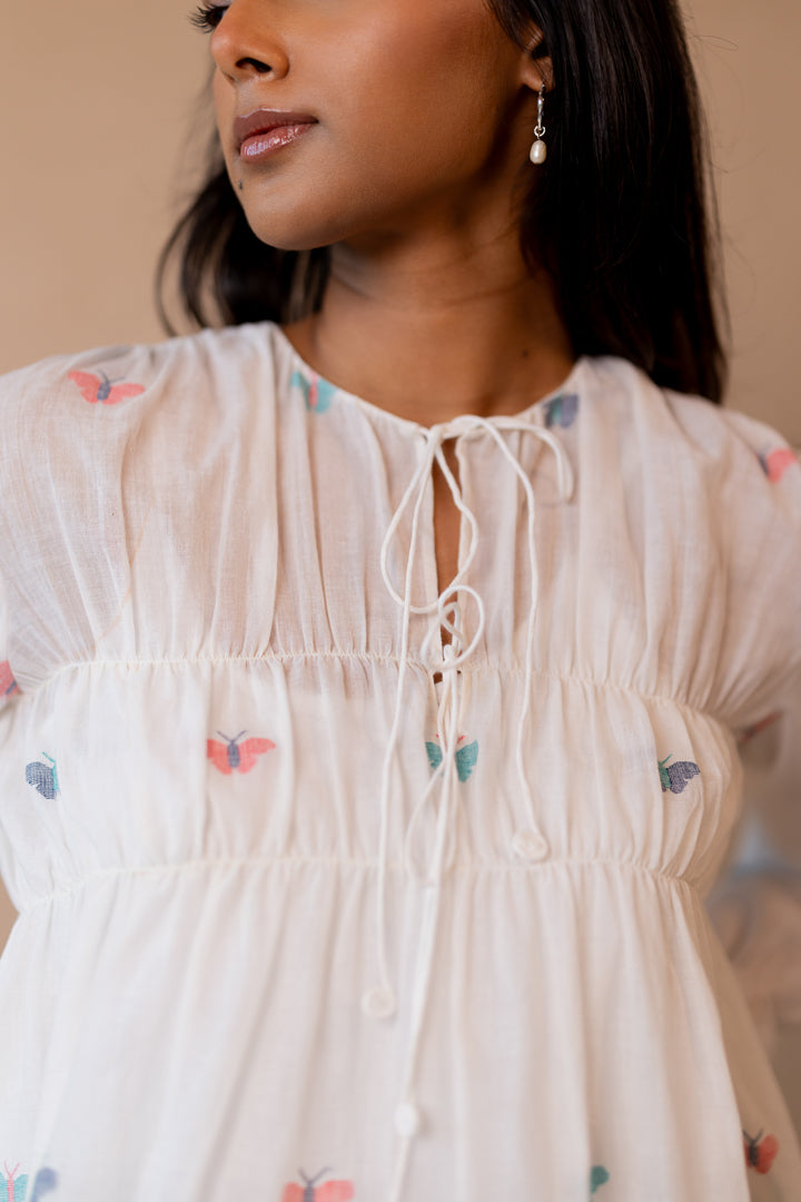 - Gathered top made from lightweight mul cotton in all-over Jamdani butterfly motifs