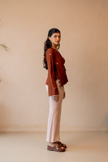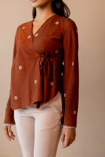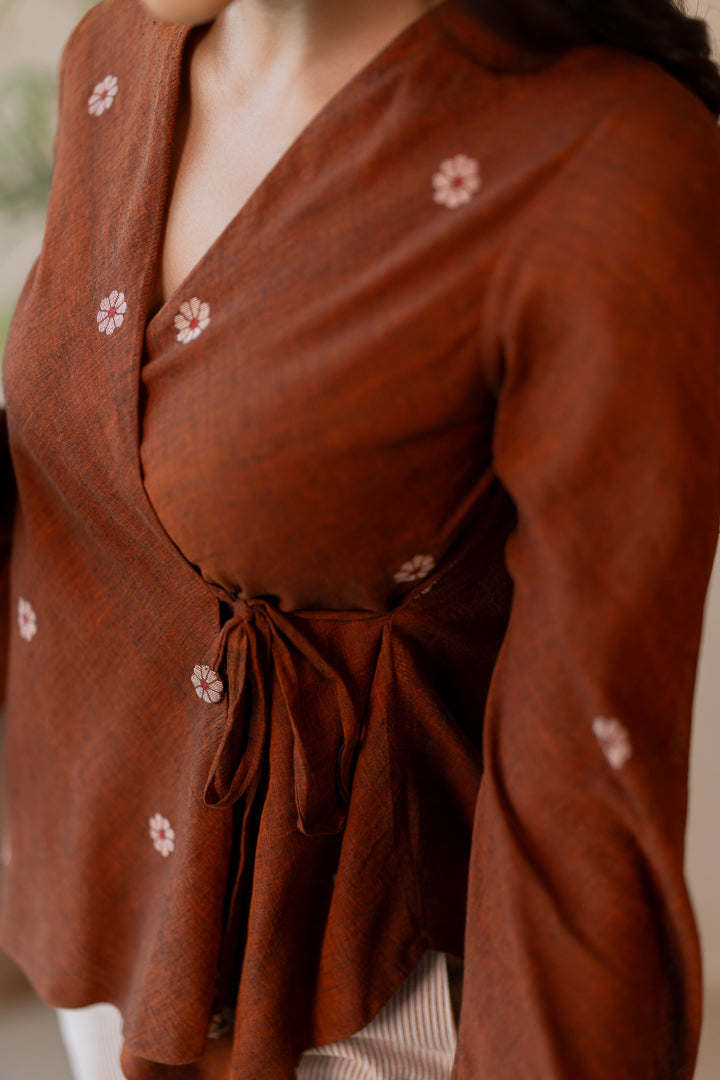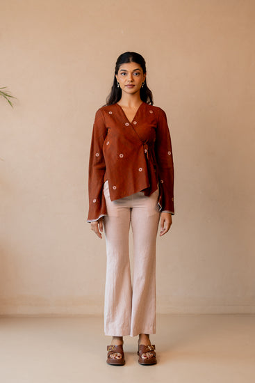 An adjustable wrap-around blouse made from lightweight mul cotton in all over Jamdani phool buttis