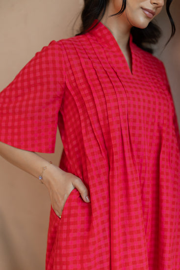 Pleated Dress made from handspun and handwoven cotton with all-over checks